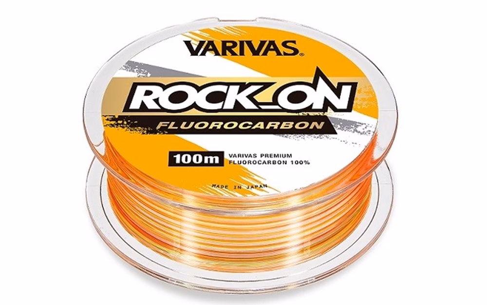 Roca Varivas sobre fluorocarbono. Varivas de fluorocarbono. Varivas Rock On es el nuevo fluorocarbono específico para la pesca en roca, súper resistente al roce y al desgaste, está especialmente indicado para pescar en tierra sin ninguna dificultad. Gracias a las nuevas tecnologías de producción, cada bobina se enrolla con la técnica de bobinado paralelo que no aplasta el hilo entre una bobina y otra, manteniendo así intactas las características principales. Tiene un peso específico de 1,78 y un alargamiento moderado; el color Base Naranja de alta densidad ayudará al pescador con las picadas más imperceptibles.