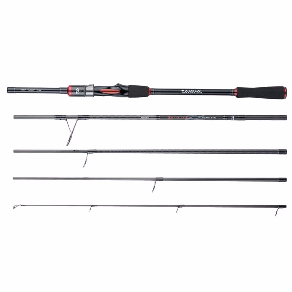 Canne spinning Daiwa 21 Ninja Evo Travel. Canne spinning de voyage Daiwa en carbone en cinq parties, avec étui souple. Anneaux Seaguide, porte-moulinet coloré visible, poignée EVA. Action progressive et puissante.