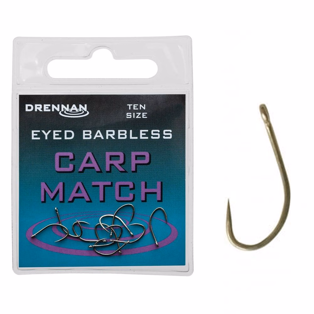 The Drennan Eyed Barbless Carp Match Hooks are produced in medium gauge super high carbon steel Carp Match hooks have a special bend and extra long curved point to improve both hooking and holding. Ideal for waggler or pole fishing and for a wide variety of baits from maggot to corn, meat and pellet. They are also perfect for tying up neat match style hair rigs using a knotless-knot.
