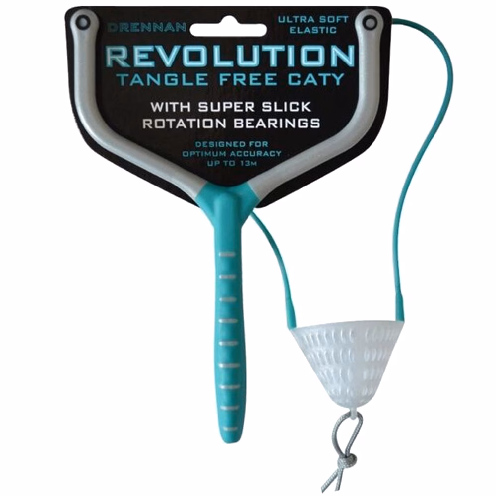 Drennan Revolution Tangle Free Caty. La Drennan Revolution Tangle Free Caty revolution caty è una serie di fionde Drennan appena uscite in catalogo. Il problema perenne con le fionde è la torsione dell'elastico. In questo modello è stato inserito un cuscinetto per ruotare liberamente e ridurre grovigli al minimo assoluto. L'impugnatura ergonomicamente si adatta perfettamente alla mano ed è studiata per per ridurre l'usura elastica all'estremità del telaio. La coppetta conica di medie dimensioni è perfetta sia per i bigattini che per il pellet. La serie è composta da quattro modelli che si differenziano per colore e durezza dell'elastico.