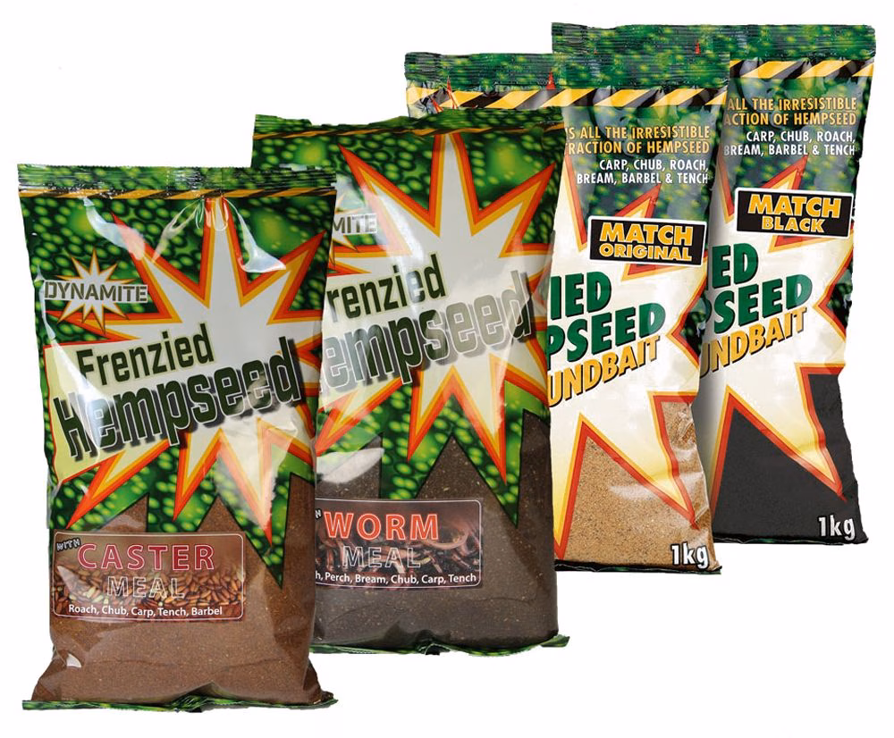 Amorce "Dynamite Frenzied Hempseed Groundbait". Les quatre versions d'amorce sont de consistance assez fine et, comme elles sont pleines de particules de chanvre et d'huiles, elles s'avèrent irrésistibles pour toutes les espèces, en particulier la carpe, le chevesne, le barbeau, le gardon et la tanche.