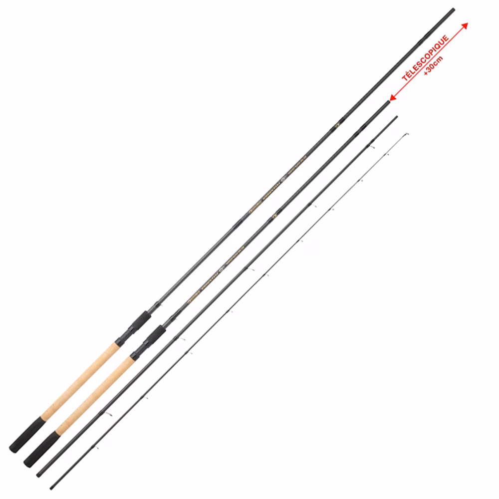 La canne à pêche à l’anglaise Garbolino ESSENTIAL X-TEND PERFECT MATCH 4,20 > 4,50 m. arbore le tout nouveau look des cannes haut de gamme ESSENTIAL et jouit également de la toute dernière et exclusive innovation MADE BY GARBO’, le procédé X-TEND. D’un simple tour de main au niveau du blank de la canne, vous extirperez une extension de 30 cm logée à même le talon-poignée de votre canne. Ainsi d’un modèle de base de 4,20m, vous passerez à un modèle de 4,50m pour gagner encore en puissance de levier ou pour pêcher en fixe dans des fonds où 4,20m ne sont pas suffisants. Les deux longueurs dont vous disposerez en agissant sur le talon X-TEND, permettent de propulser sans difficultés des flotteurs imposants et lourds (8 à 25gr) que requiert une pêche par parfois grande profondeur et/ou distance, au fixe comme au coulissant. Ses anneaux surélevés T RING au nombre de 18 placés sur 3 brins égaux, facilitent la trajectoire du nylon et rendent les lancers plus précis tout en favorisant le passage du nœud d’arrêt. Un accroche-ligne prend place à la base du blank pour y fixer l’hameçon lorsque vous ne vous en servez pas ou que vous souhaitez modifier vos réglages. La poignée mixte liège et mousse EVA à la base permet une préhension efficace et confortable lors des lancers grâce à un ingénieux méplat. Construite en carbone Haut Module, elle ne pèse que 180g et ravira les compétiteurs les plus exigeants, amoureux du très beau matériel et à la recherche d’un outil polyvalent et novateur. Disponible aussi en 3m90 pour une puissance de 7 à 20g.