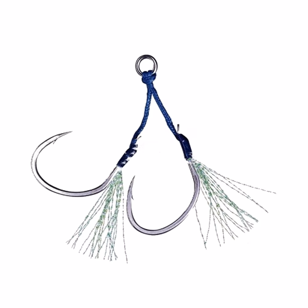Hameçons Jatsu Rush Twin Assist, double assistance développés pour le jigging léger et lent. Les Jatsu rush Twin sont fabriqués avec des hameçons BKK 8084 attachés et bloqués avec de la résine époxy, un anneau en acier massif et une tresse jig haute résistance avec la couleur bleue caractéristique.