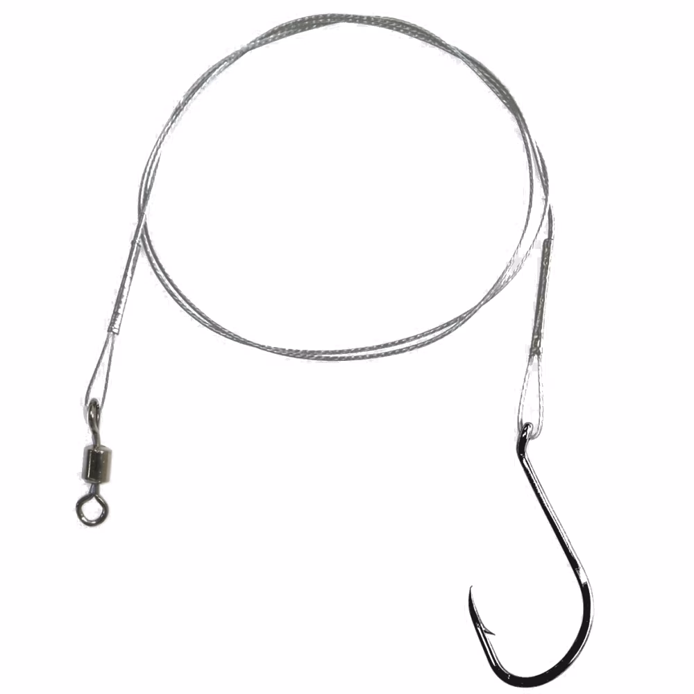 Magma Tuna Card avec émerillon. Hameçons de pêche en mer déjà montés avec un avançon en fil d'acier, idéal pour la capture de poissons à dents acérées tels que le congre ou le poisson bleu. L'émerillon assure une mobilité maximale de l'appât et réduit l'emmêlement de la ligne pendant le lancer.