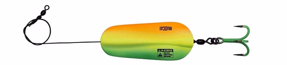 Cuillère en ligne Madcat A-Static. Cuillères à poisson-chat lourdes en ligne, adaptées au lancer sur de longues distances. L'avantage de la construction en ligne est qu'un wels ne peut pas utiliser la lame comme levier pour tenter de se débarrasser du leurre, car alors la cuillère glissera simplement loin des aigus, vers le haut. Taille des aigus : 3/0. A-STATIC, signifiant : recouvert de caoutchouc, pour minimiser le champ électrique qui effraie le poisson-chat. Attention : le revêtement en caoutchouc peut s'user lors de l'utilisation.