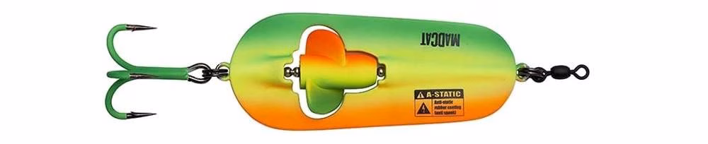 Autre innovation de MADCAT® : une cuillère hochet. Nage comme une cuillère mais… possède un corps rotatif avec de petites boules à l'intérieur, pour attirer encore plus l'attention. Taille des aigus : 3/0. A-STATIC, signifiant : recouvert de caoutchouc, pour minimiser le champ électrique qui effraie le poisson-chat. Attention : le revêtement en caoutchouc peut s'user lors de l'utilisation.