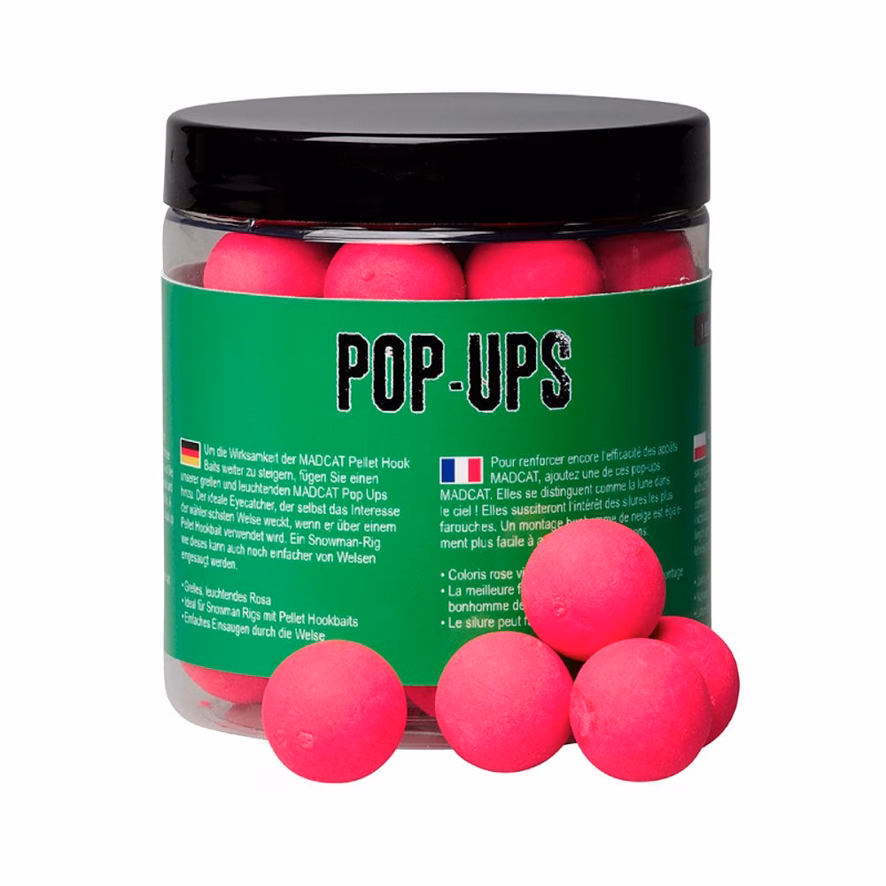 Pour augmenter encore plus l'efficacité des appâts MADCAT Pellet Hook Bait, ajoutez l'un de nos MADCAT Pop Ups vifs et lumineux. L'accroche-regard idéal qui éveille l'intérêt même des silures les plus difficiles lorsqu'il est utilisé au-dessus d'un pellet hookbait. Un snowman rig comme celui-ci peut aussi être aspiré encore plus facilement par les silures. 100 grammes.