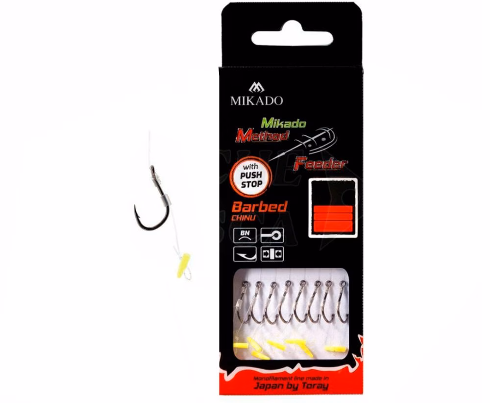 Mikado Method Feeder Rigs Monofilament Chinu avec Push Stop. Bas de ligne prêts à l'emploi pour la pêche au feeder, fabriqués à partir de matériaux de la plus haute qualité pour créer un produit de qualité supérieure. Chaque paquet contient 8 bas de ligne montés avec du monofilament TORAY et des hameçons japonais pour une pénétration efficace.