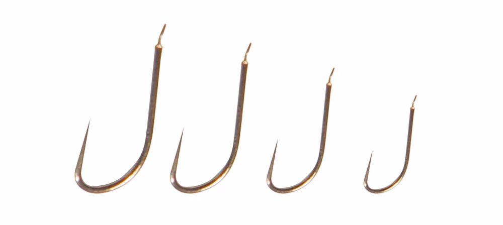 Crochets Milo série K. Hameçons de pêche droits et bronzés, sans ardillon, à tige moyenne. Il s'agit d'un hameçon extrêmement léger, réalisé en carbone 110 (le 17, ne pèse que 0,089 dg) pour les poissons les plus suspects (chevesnes, carassins et carpes) en enfilant des appâts très petits et délicats. Exceptionnel pour attraper le chevesne dans les eaux très claires.