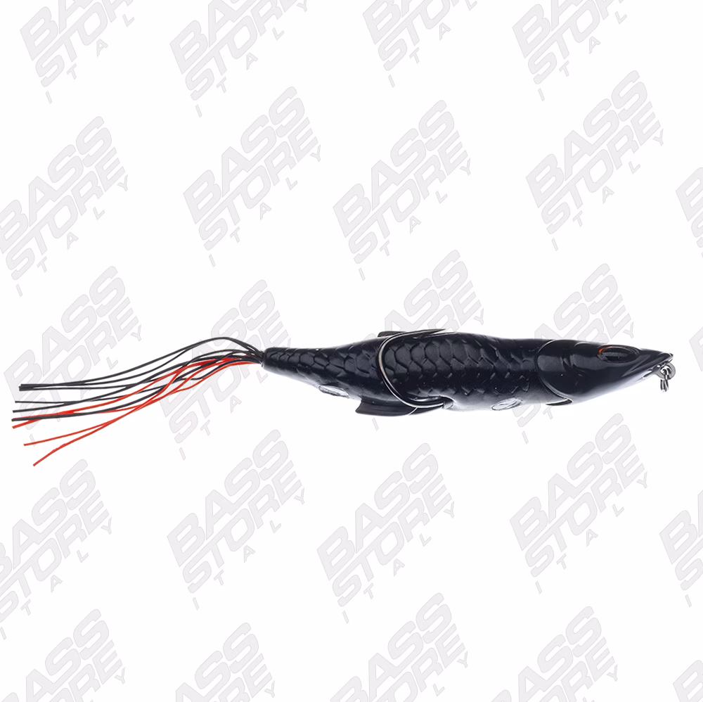 Promenade Molix Supernato. Le Molix Supernato Walk est un appât pour la pêche à couverture lourde avec une plus grande gamme d'utilisation et d'action, adoptant une solution hybride et polyvalente : en surface comme un WTD classique, à moyenne profondeur comme un jerk ou au fond comme un appât souple. Il est donc efficace pour pêcher partout où se trouve le poisson. En le plongeant dans l'eau, avec une légère pression sur le corps, la quantité nécessaire pour l'utiliser à la profondeur souhaitée entrera dans l'appât. Le Superborn Walk nage sinueux en surface ; à moyenne profondeur et en mode "suspension", au stop & go il dérape irrégulièrement. Partiellement rempli d'eau, il saute sur les fonds marins les plus complexes tel un petit poisson fourrage s'enracinant au fond, en se maintenant vertical. Le double poids détermine un équilibre idéal dans toutes les situations. On peut ainsi miner notre cible qu'elle soit en surface, suspendue ou proche des fonds marins, sans être influencé par des obstacles à flot ou immergés. La jupe arrière, en caoutchouc silicone, accentue la sinuosité du mouvement de descente et de récupération. Il est équipé d’un double crochet OMTD personnalisé et robuste. Approuvé par Mike « Ike » Iaconelli.