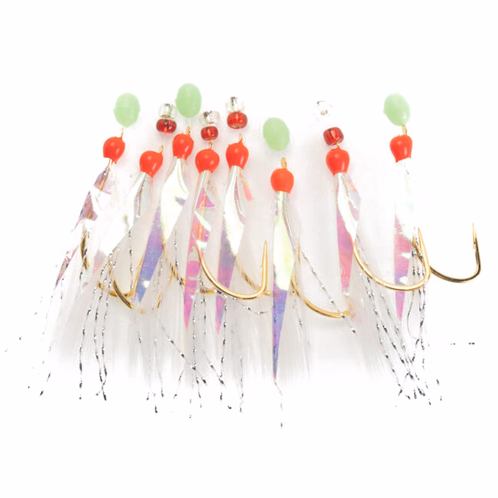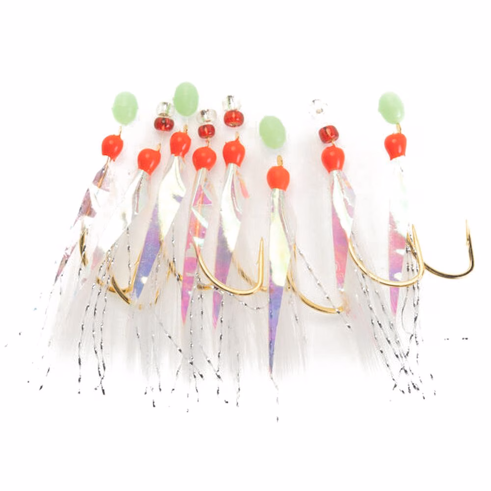 Sabiki per la pesca in mare bicolor rosa / bianco riflettenti realizzati con la pelle di pesce ed ami Mustad, prodotto di alta qualità con filo e 8 ami di qualità. Una perlina riflettente ed i colori alternati migliorano l'effetto visivo, anche pescando di notte o in profondità. Ideale per qualsiasi tipo di pesci marini, dagli sgombri in ... poi.