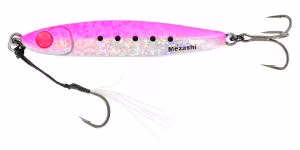 Mustad Mezashi metal-jig. Le dernier casting jig de Mustad, le Mezashi Casting Jig, se caractérise par une action irrégulière attrayante avec des flashs réfléchissants irrésistibles. L'œil de couleur translucide réfracte la lumière pour créer une lueur naturelle attrayante dans l'eau qui ne manquera pas d'attirer l'attention des poissons prédateurs marins. Pour obtenir une action de wobbling intense lors de la récupération, ce sea jig a été construit avec un corps asymétrique avec une forme ronde d'un côté et une forme triangulaire de l'autre. La répartition du poids ne fait qu'accentuer la vivacité de l'action. Conçu au Japon avec des matériaux réfléchissants de haute qualité. Il est équipé d'un hameçon Mustad UltraPoint assist monté à l'avant et d'un hameçon triple UltraPoint à l'arrière.