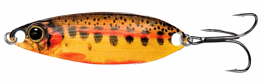 Nomura Masuku Real Spoon - cuillère. Cuillères pour la pêche à la truite de lac et de rivière, à la perche et à l'aspe. Leur particularité réside dans leurs couleurs 3D haute définition ultra réalistes qui imitent parfaitement les livrées de vrais poissons. Le mouvement de ces leurres métalliques est irrégulier et très attractif pour tout poisson prédateur.
