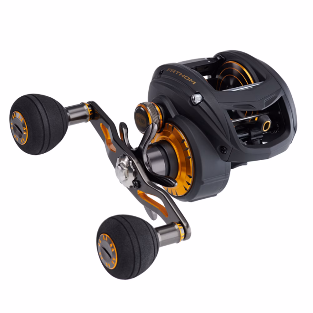Penn Fathom. I mulinelli da casting PENN ® Fathom offrono tutte le caratteristiche necessarie per affrontare i predatori d'acqua salata più impegnativi. Il corpo completamente in metallo è indistruttibile e la piastra laterale destra anch'essa in metallo. Abbinati a un ingranaggio principale interno in ottone e un pignone supportato da cuscinetti, offrono una trasmissione con una potenza ineguagliabile durante il recupero di grosse prede. Ideali per le tecniche più gravose nella pesca in mare inshore ed offshore (tecniche verticali in primis). Il guidafilo è anticorrosione e trattato TiN per la massima scorrevolezza del filo. Questa serie di mulinelli eccelle nelle tecniche verticali come jigging, tataki,inchiku, slow pitch jigging, ma anche traina. Il modello taglia 400 ha il guidafilo sincronizzato con la frizione. La leva è lunga e sviluppa molta potenza anche per fondali impegnativi. I Penn Fathom sono consigliati anche per la pesca di luccio e siluro. Manovella sinistra.