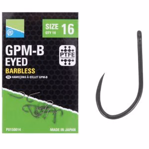 Preston Innovations GPM-B Eyed Barbless, hameçons Preston avec oeil et sans ardillon. Le Preston GPM-B Eyed est un hameçon idéal pour tous les types de poissons et est parfait pour un large éventail de pêches aquatiques commerciales. Ils sont dotés d'un revêtement PTFE qui améliore la durabilité et la capacité d'hameçonnage et réduit également la visibilité dans l'eau, ce qui signifie que les poissons ne sont pas effrayés par les hameçons brillants. Le Preston GPM-B Eyed Barbless est également doté d'un œil surdimensionné, ce qui entraîne une augmentation du diamètre de la ligne lors de la lutte contre les gros poissons.