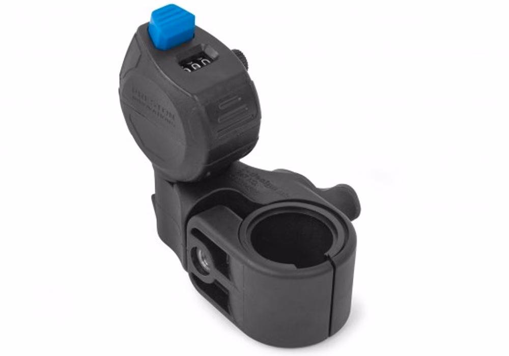 Le compteur Clicker est fourni avec une rotule Offbox comprenant des inserts, ce qui lui permet de se fixer directement au pied de pratiquement tous les sièges-paniers et repose-pieds sur le marché.