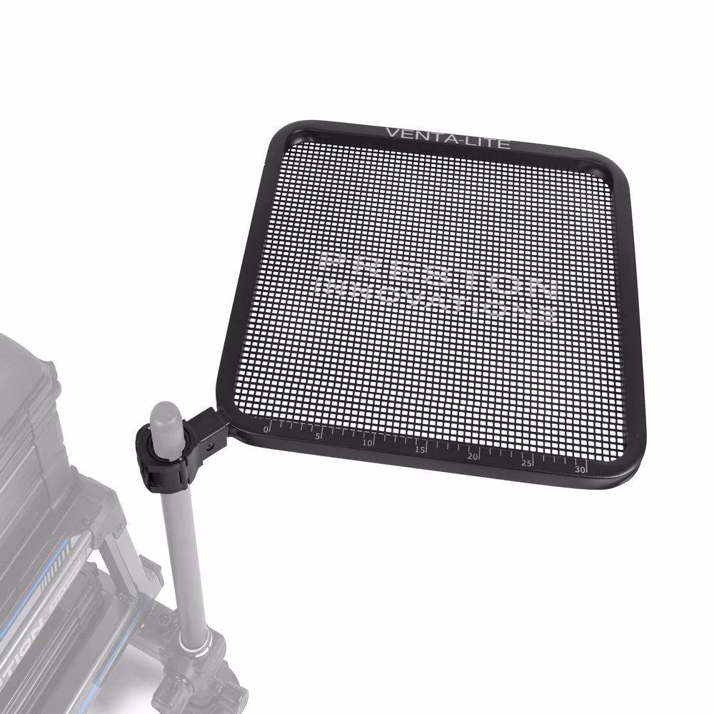 Preston Innovations Ventalite Multi Side Tray, An extremely versatile side tray that can be used in a number of ways; as a conventional side tray on the side of a seatbox, as a second ‘corner’ side tray or as a rear tray. Constructed from Venta-Lite material which helps to reduce weight and increase air circulation, keeping your bait cool. A super strong OffBox clamping knuckle is located on the corner of the tray and can be fitted to any seatbox using the supplied inserts (23mm, 25mm, 30mm) or 36mm without the use of an insert. Ventalite Slimline - Originally designed as a secondary tray to be mounted to the rear of your box, ideal for wading applications, it also doubles up as a compact solution for pegs with limited space or the angler that has minimal bait requirements Ventalite Large - The twin knuckled Venta-Lite Side Tray Large is the perfect size for most situations, with a capacity for six 3 pint bait boxes with some additional room. The mesh promotes airflow which in turn will keep your bait cool while also reducing weight. Ventalite XL - Constructed in two sections which can simply be slotted together. The tray is lightweight being made from aluminium mesh which also helps to keep your bait cool in hot conditions. It is recommended that support legs or a Side Tray Support arm is used due to the large size of this tray, two 36mm legs are supplied as standard. The XL side tray can also be used as a single piece tray with one support leg if required.