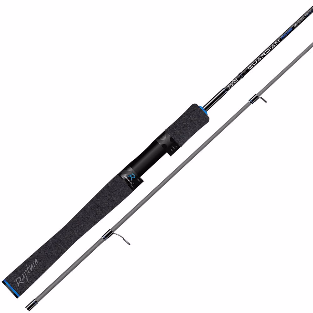 Chaque Rapture Guardian Area Trout est équipée d'anneaux monopatte avec inserts en SIC. Cette configuration contribue à contenir le poids et facilite la sortie du fil (tresse, nylon ou ester), réduisant la friction lors du lancer. Le porte-moulinet avec inserts look carbone et la poignée en EVA noir profilée assurent une prise correcte et un design actuel, complété par le logo Rapture.