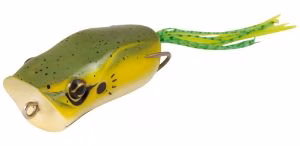 Rapture Popper Frog. Le corps de ce leurre en forme de grenouille pour la pêche du black-bass et du brochet est constitué d'un matériau souple et flexible comme la plupart des frog baits du marché, à la fois pour faciliter l'entrée dans l'eau et pour pouvoir travailler dans des situations impossibles. La tête a un profil concave et déplace une bonne quantité d'eau pendant le mouvement de la grenouille, générant ainsi le son classique qui attire les poissons prédateurs. Cette grenouille est équipée d'un robuste hameçon double à large courbure, réalisé en acier à haute teneur en carbone, dont les pointes adhèrent au profil de l'appât pour un effet anti-algues total.
