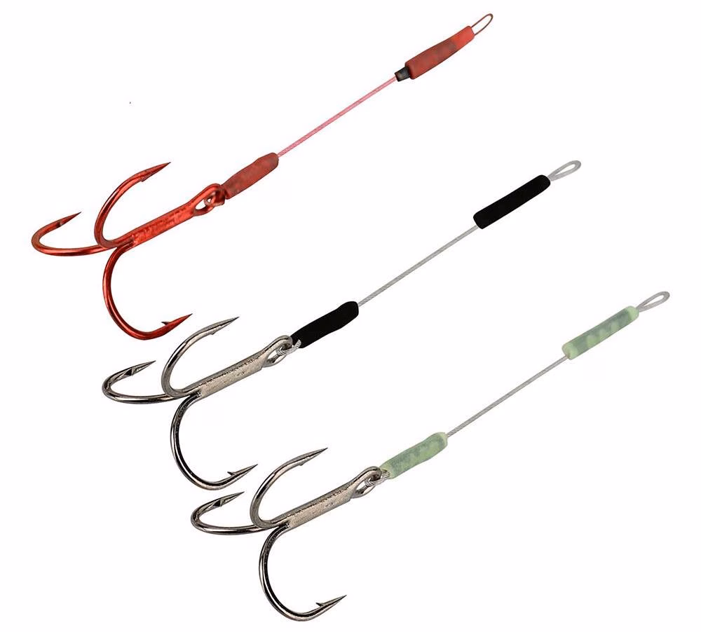 Stinger simple avec triplets SG Y, serti à la perfection avec pointe en acier au carbone gainée à 49 fils. 2 morceaux de Gunsmoke et 1 morceau de Bloodred Stinger par paquet. Un tuyau en silicone est monté sur chaque boucle pour la fixer dans l'œil de la tête plombée. • 3 pièces/paquet
