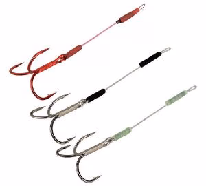 Stingers constitués d'hameçons triples SG Y-treble parfaitement manchonnés sur un fil d'acier gainé de 49 brins. 2 dards noirs et 1 dard rouge par paquet. Chaque boucle est équipée d'un tube en silicone qui permet de fixer facilement le dard sur une tête plombée. • Cdt les 3 pièces