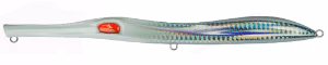Il Balosso 210 è un needle galleggiante che ha impegnato i nostri progettisti per molti anni. Abbiamo voluto creare una pencil bait che permettesse un recupero molto versatile ma ancor più performante nel momento in cui si effettuano le tipologie di recupero che in questi anni si sono dimostrate più catturanti nei confronti delle specie target tipiche di questa esca: pesci serra e lecce. Estremamente efficace quindi sia su pesci tendenzialmente apatici, in particolare durante il periodo invernale, eseguendo recuperi lineari lenti o con un leggero ma ampio wtd, e sia su pesci più attivi con un recupero wtd più veloce e più stretto, fino a farlo letteralmente saltellare sulla superficie con un recupero velocissimo per simulare i pesci in fuga e in particolare le aguglie a cui assomiglia. La sua forma molto aerodinamica, associata ad un peso di ben 34 g, permette lanci lunghissimi. Dotato di armatura passante e ancorette BKK 4x strong break round treble hook #2 grazie ad un mutuo contratto di collaborazione reciproca con la ditta BKK, leader del settore, che si estenderà a tutti i modelli del nostro catalogo in un breve periodo di tempo e che ci autorizza all’utilizzo del marchio BKK direttamente sulla confezione dell’artificiale. Dedicato principalmente al pesce serra e alla leccia ha dato grandi risultati nei nostri test anche su barracuda e spigole ma ha un chiaro potenziale su tutte le specie che effettuano attacchi a galla.