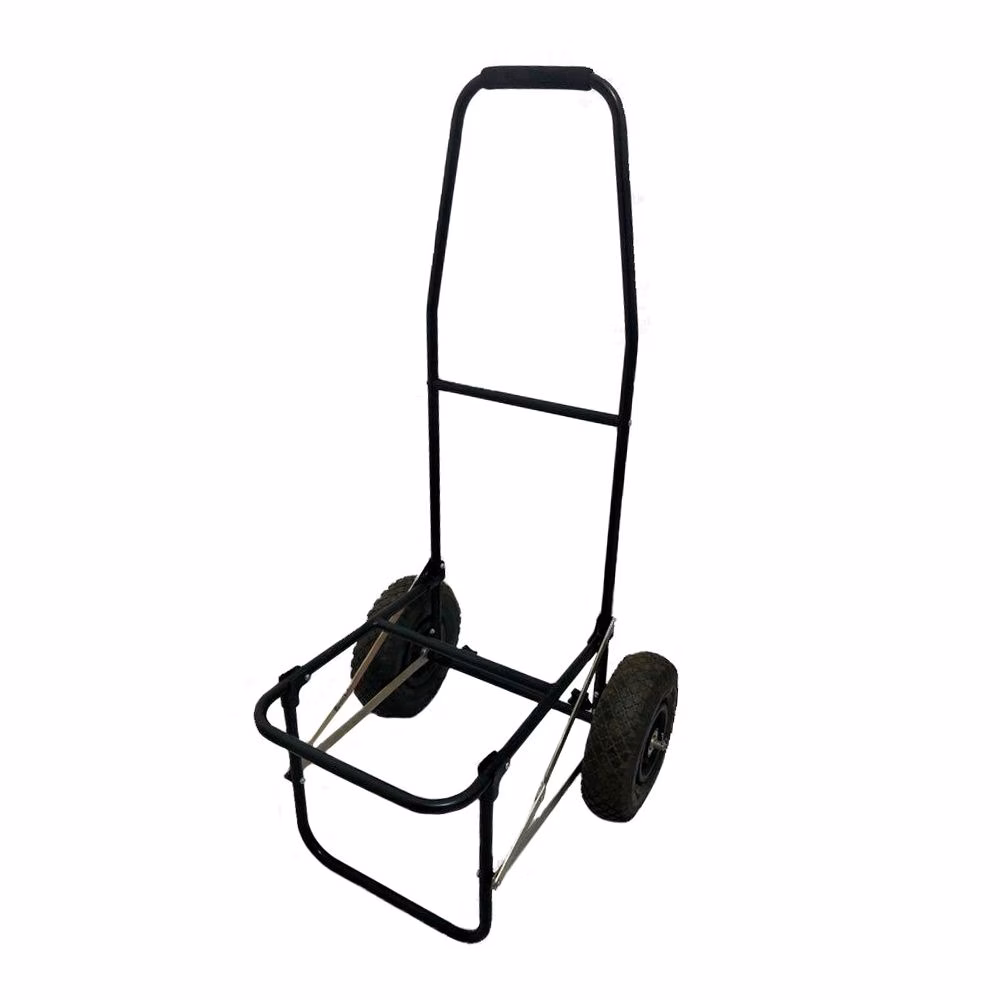 Chariot Sensas Club. Il s'agit d'un chariot très robuste, spécifiquement conçu pour le transport de matériel de pêche tel que les bourriches, sacs et cannes, notamment dans le cadre de la pêche au coup ou d'autres types de pêche sportive. La conception caractérisée par un cadre métallique noir, deux grandes roues pneumatiques et une poignée est idéale pour transporter l'équipement de pêche même sur des terrains irréguliers ou boueux.