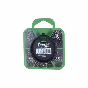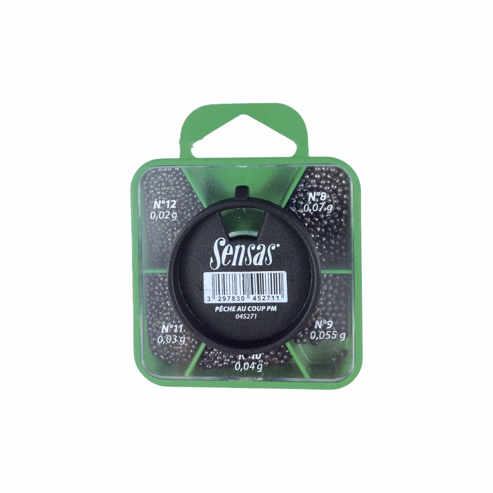 La mascotte Piombo Pesca Standard Sensas contient un assortiment de cinq dimensions de palettes : GM (6, 5, 4, 2, 0) et PM (12, 11, 10, 9, 8).