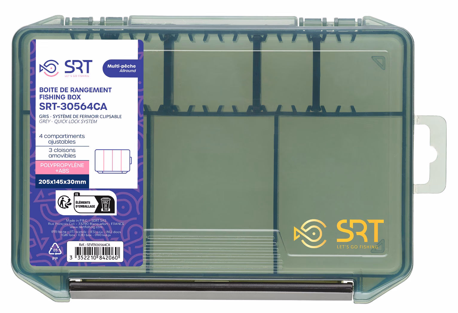 Le Sert SRT 30564 CA est une boîte à pêche pour appâts et accessoires avec pas moins de 7 séparations grandes et petites pour une organisation parfaite du matériel de pêche. Fabriquée en plastique de haute qualité, elle est résistante aux chocs et aux produits chimiques pour les appâts souples. Avec serrure de sécurité renforcée.