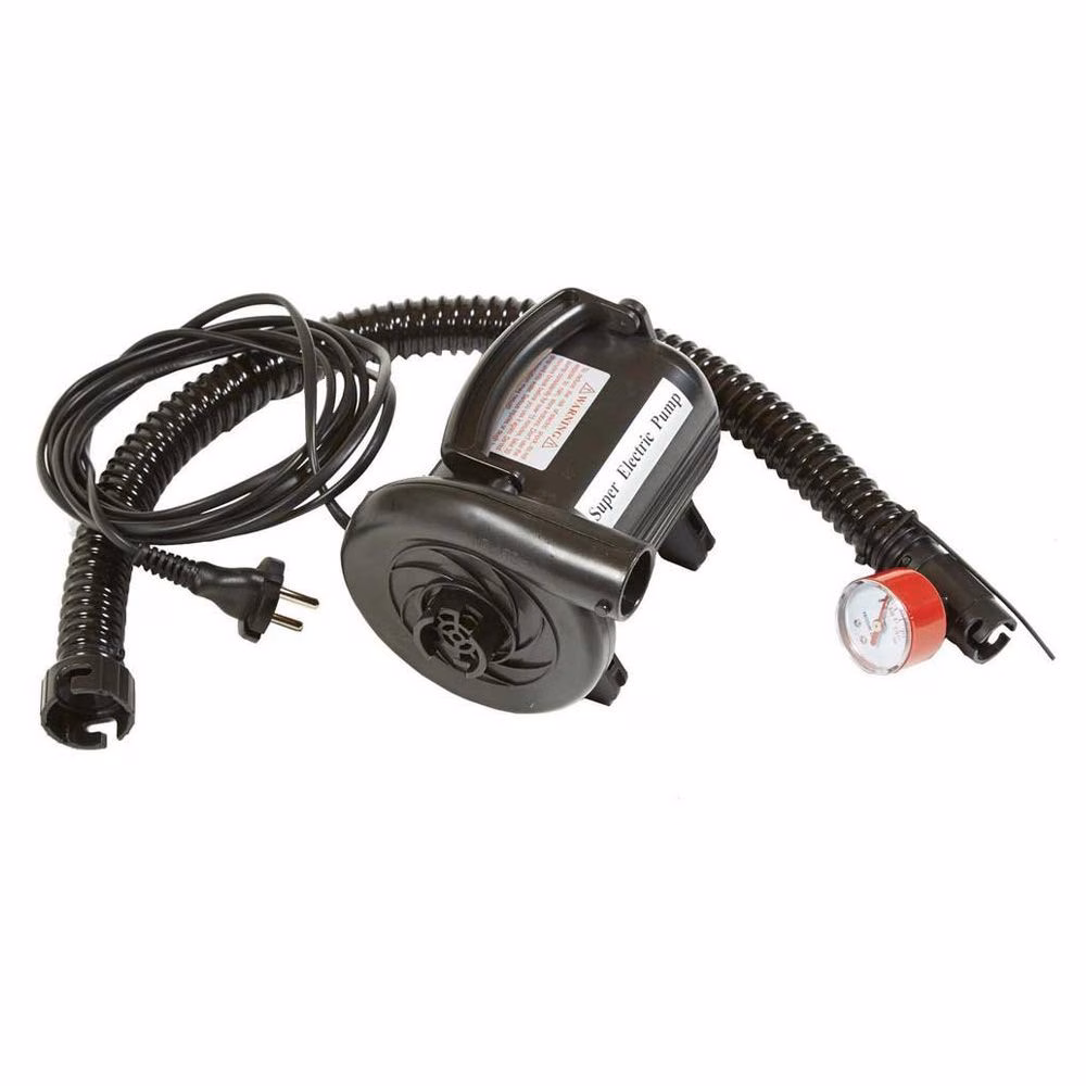 Pompe électrique JMC 220V, compresseur et pompe électrique pour bateaux ventraux, kayaks, dériveurs et autres. La pompe électrique pour float tube, dériveurs, kayaks et autres est livrée avec 3 adaptateurs pour chaque type d'attache et une prise Schuko. La pompe à air électrique permet de gonfler et de dégonfler rapidement les bateaux pneumatiques, les dériveurs, etc. Cet ensemble complet et pratique est le premier choix pour toutes les applications où de grandes quantités d'air doivent être remplies ou des pressions élevées doivent être pompées. Équipé d'un manomètre qui détecte la pression à l'intérieur de la chambre à gonfler.