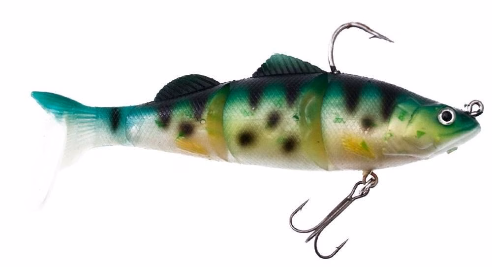 Trendex Soft Jointer jointed swimbait for pike. Multi Segmented Tail t. hooks + single hook, boot tail shape. Questa shad snodata, ha un movimento irresistibile in caduta, grazie ai numerosi snodi. Coda paddle e colorazioni adescanti. Dotata di ancoretta più amo dorsale. Esca consigliata per pesca del luccio.