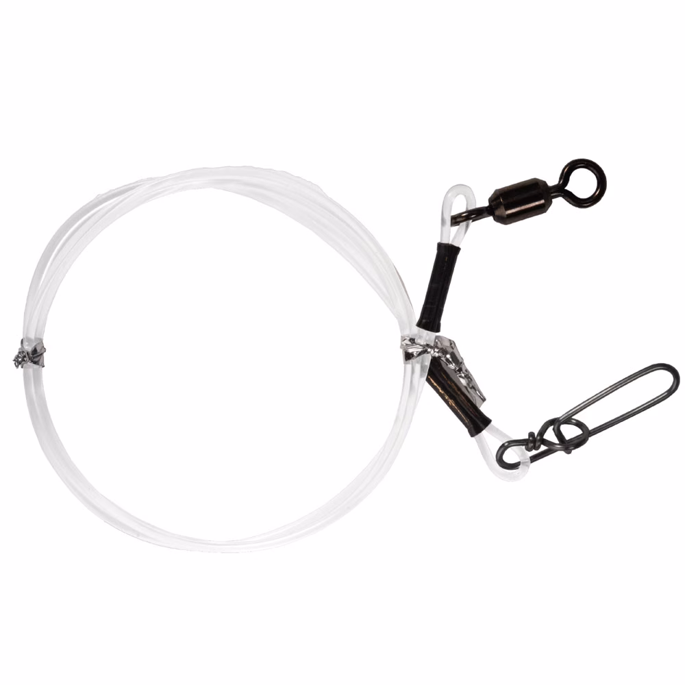 Invisibilità in acque limpide: Risulta molto meno visibile dell'acciaio, rendendo l'esca più naturale. 2. Resistenza all'abrasione: Materiale rigido che protegge da denti affilati, rocce e strutture. 3. Connessione sicura e rapida: Girella in acciaio e moschettone robusto per cambi esca veloci senza torsioni.