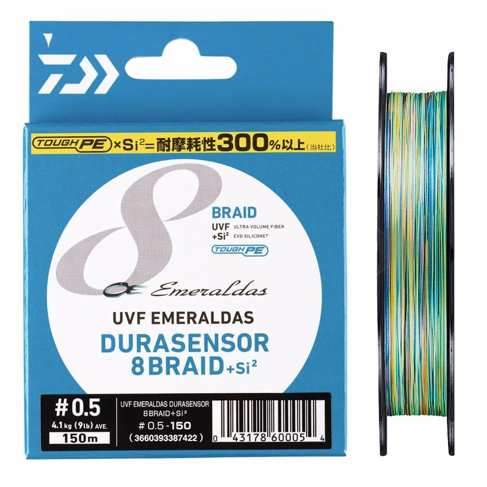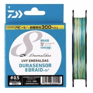 L'UVF Emeraldas Durasensor 8X+Si2 della Daiwa è un filo trecciato PE ad 8 capi sviluppato appositamente per l'Eging Game! È stato studiato per garantire sensazioni di lancio nitide e fluide, la massima sensibilità e affidabilità totale! Questa treccia da eging, è specifica per l'utilizzo con totanare e squid-jigs vari, ha un trattamento UVF (Ultra Volume Fiber) per maggiore forza e resistenza all'abrasione, è prodotto con il nuovo materiale TOUGH PE con fibre più rotonde, spesse e robuste che migliorano la durabilità e la tenuta.