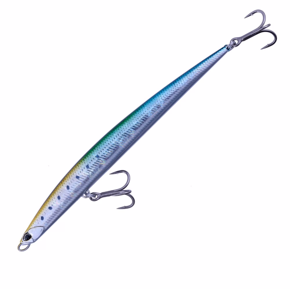 The DUO Press Bait Saira is a slim and long-bodied jig minnow created to mimic the thin, long bait-fish sought by Tuna and other large migratory fish species. It has a unique body design, with sufficient strength and weight for use with heavy tackle. This lure has allowed new tactics for anglers fishing on or offshore.