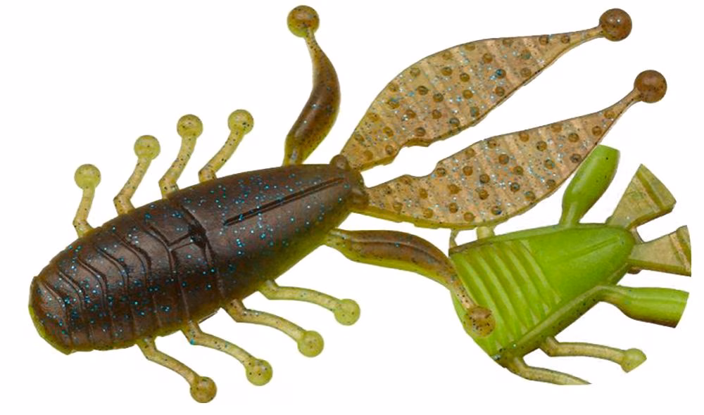 Evergreen Kicker Bug Fat Baby. Le Evergreen Kicker Bug Fat Baby 3.3" sono le nuove creature Evergreen disegnate Toshifumi Kikumoto, presenta la stessa forma beaver del classico Kicker Bug, ma con un corpo più voluminoso. Lateralmente presenta due codine e otto zampe con una piccola sfera di gomma in punta e nella parte finale presenta due chele principali molto ampie, sempre con una piccola sfera finale. Queste piccole sfere simuleranno in maniera molto realistica il movimento, i rumori e lo spostamento d'acqua prodotti da un gambero e sono molto adescanti per la pesca del black bass. Può essere innescato come trailer in qualsiasi jig, ma l'utilizzo ottimale è il Texas Rig.