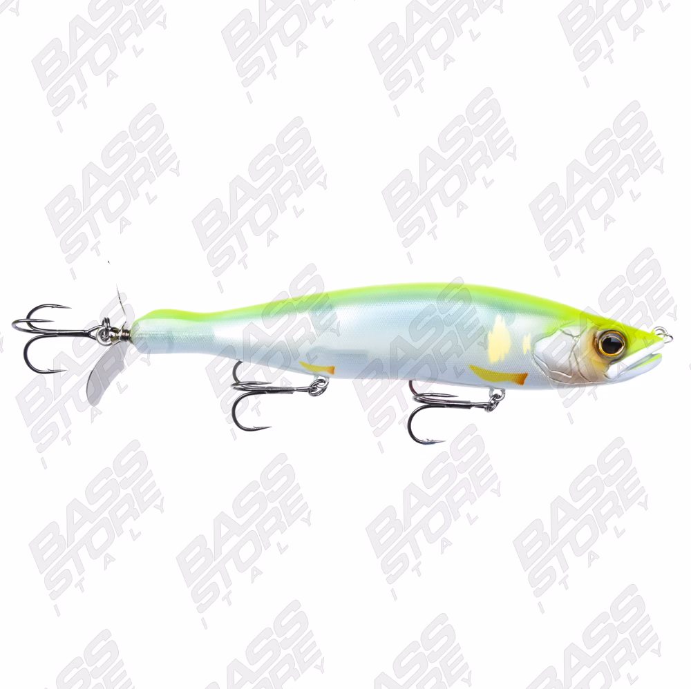 Gan Craft Kaiten 178. Questa esca Gan Craft è una Spy Bait extralarge pensata per presentazioni a recupero costante (a varie velocità di recupero) da utilizzarsi pervalentemente su spot in acqua aperta. Un propeller affondante che si differenzia dalle comuni Spy Baits oltre che per la taglia anche per il suo assetto di nuoto statico con un wobbling ed un rolling decisamente contenuti. Big bait caratterizzata da un'ottima lanciabilità ed un costante affondamento permettendo di sondare molta acqua in poco tempo e discendere e scegliere rapidamente a che altezza far lavorare la nostra esca. Il Gan Craft Kaiten 178 è un esca che ha già dato grandi risultati, nelle situazioni più ostiche, ai pescatori che si sono dedicati alla ricerca dei grossi bass