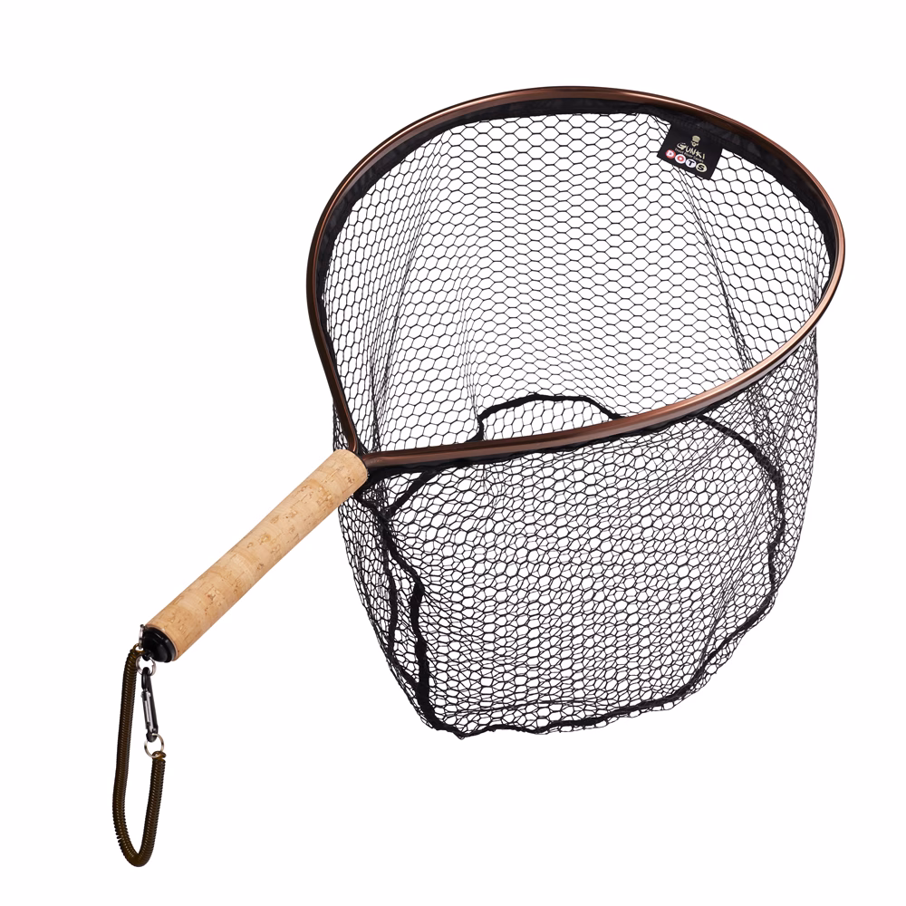 DOTS MAGNET LANDING NET, Racket style landing net designed for the wading trout angler. Powerful magnetic clip on the handle that will fix to your jacket or wading vest and can be pulled free when needed. The net comes with a security cord should it slip out of your hands. The frame is light, compact and easy to manipulate. The mesh is suitable for lure anglers and coated in quick drying PVC to help protect your trout. Ideal for fishing overgrown sections on small to medium rivers.