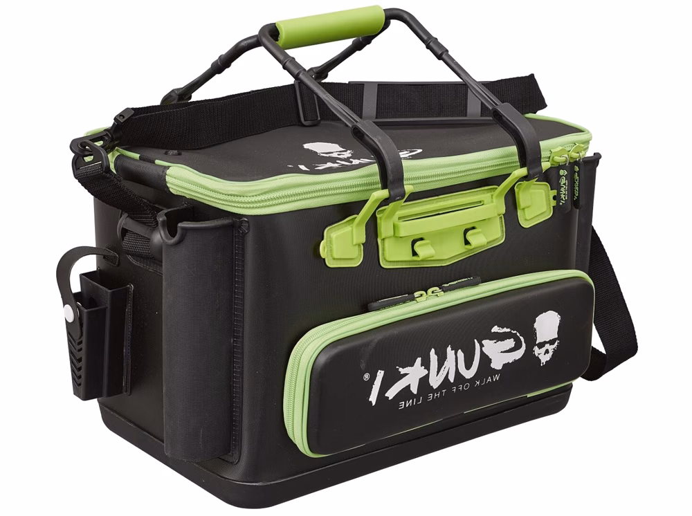 Gunki Safe Bag Edge 40 Hard. Borsa rigida in Eva di ben 2 mm, solida e impermeabile dotata di coperchio rigido. Grazie alla cinghia tracolla regolabile la si riesce a trasportare con facilità, inoltre lateralmente presenta scompartimenti per pinze e porta canna. Grazie alle sue dimensioni, è possibile inserire all’interno altri tipi di borse o attrezzatura che si vuole tenere al riparo dall’acqua (pioggia o schizzi in barca). Ideale per tutte le tecniche, in particolar modo street fishing ed area trout