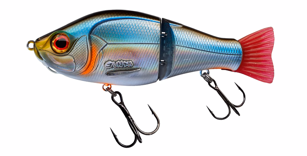 Gunki Scunner. Swimbait Gunki con movimento ad S molto adescante, per via dello snodo centrale rinforzato. Ideale per sondare lo strato più alto d'acqua e passare in mezzo a rami o strutture molli, ma anche sopra a massi affioranti. Quando lasciata affondare liberamente ha un azione che oscilla sul proprio asse, simulando un pesce moribondo in procinto di ribaltarsi e dunque una facile preda per black bass e lucci. Questa swimbait Gunki ha un sistema di aggancio sulla testa per variarne la velocità di discesa a seconda delgli spot e dell'attività dei pesci predatori.