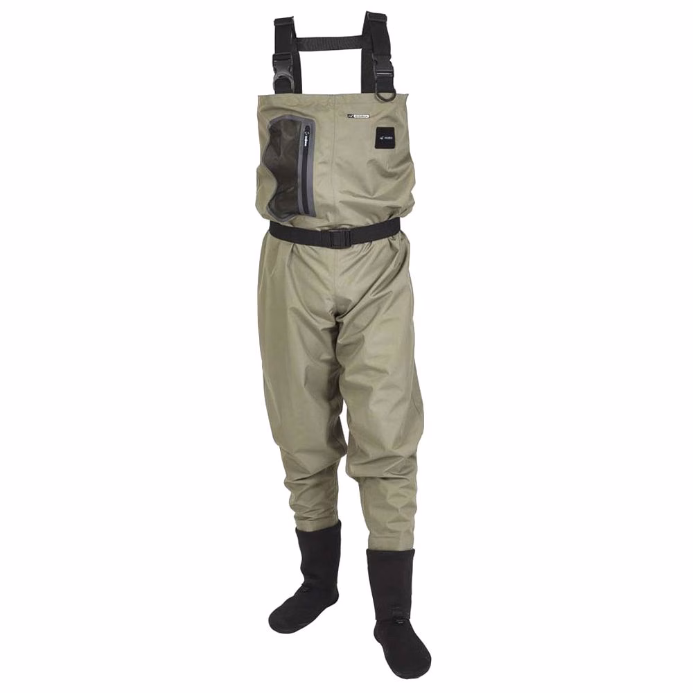 JMC Hydrox First Olive V2. I waders traspiranti Hydrox FIrst Olive V2 JMC sono waders di alto livello di traspirabilità estremamente leggeri, robusti e affidabili. Sono realizzati in microfibra a 3 strati con cuciture rinforzate. Il taglio delle gambe senza cuciture interne evita l'usura e la rottura prematura dovuta a ripetuti sfregamenti. Leggeri e flessibili, questi waders consentono una grande libertà di movimento in ogni direzione. Un taglio moderno, enfatizzato da bretelle regolabili e una cintura da wading altrettanto regolabile consentono una vestibilità perfetta per il massimo comfort. Il wader JMC FIRST V2 è inoltre dotato di una tasca interna ed esterna e una toppa esterna in velcro per gli artificiali. Ideali oltre che per il torrente, anche per numerose altre tecniche quali spinning in mare, belly boat etc. JMC Hydrox First Olive V2. series are made of 3 layer breathable membrane on a tough fabric. It is cut without stiching on the inseeam to prevent premature wear and has taped reinforced seams. They are lightweight, comfortable and affordable. These waders have adjustable suspenders, a wading belt, bi density neoprene stockings, gravel guards and an inside pocket. Sold in a cloth bag.