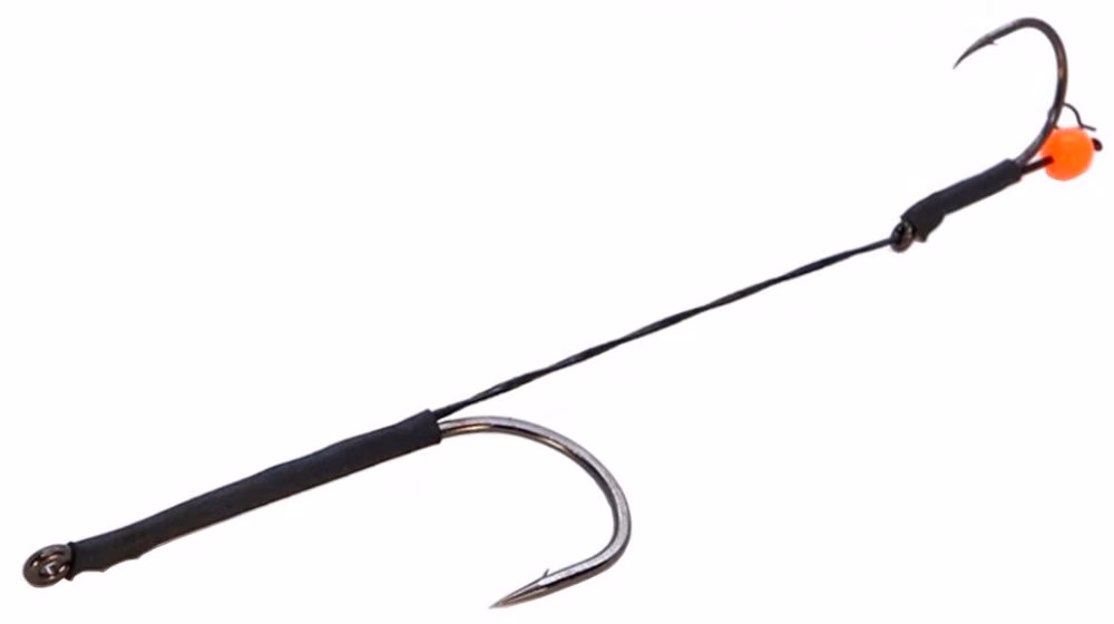 JMC Pike Ready Double Snap. Montatura per la pesca a mosca del luccio, dotata di un secondo amo e una particolare appendice che permette di aggiungere un' esca morbida come un "grub". Ideale per armare uno streamer tipo "Tube Fly" o streamer da luccio convenzionali.