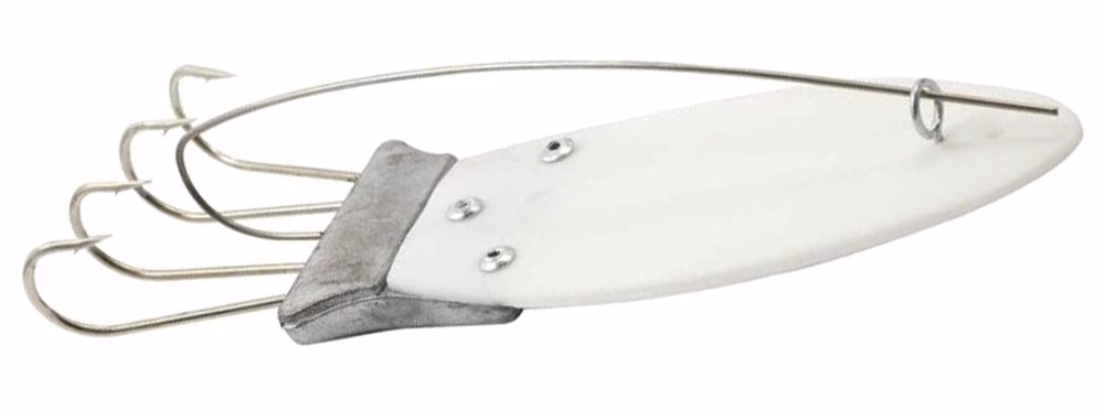 Polpara a striscio in madreperla, indicata per pescare il polpo a scarroccio a terra (sul fondo). Questa polpara "da strascico" piatta con gli ami disposti a pettine viene utilizzata con terminali innescati con esche naturali come sarda, boga, granchio o di imitazioni in "gomma" come il granchio finto.