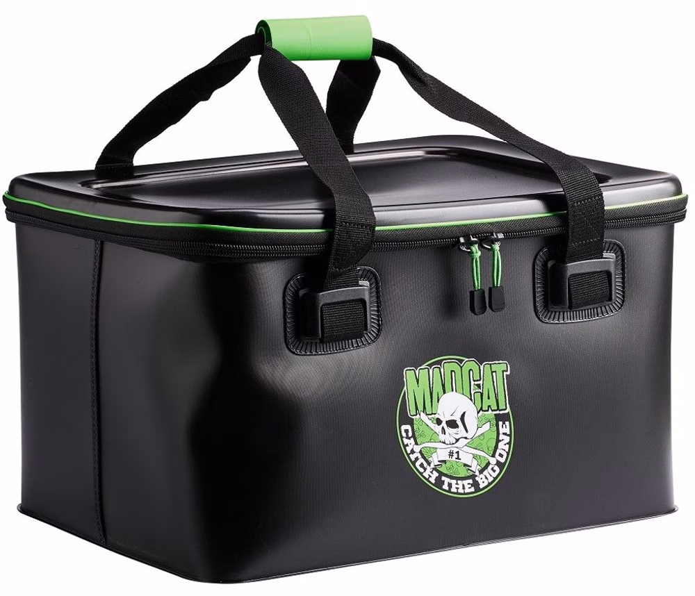 Madcat Tackle Tainer. Borsa in Eva impermeabile dedicata agli amanti della pesca. Borsa da trasporto in EVA di buone dimensioni MADCAT. Estremamente stabile grazie alla parete e al fondo spessi 1,5 mm. Ha un coperchio aderente in modo da poterlo utilizzare anche come tavolo. Impermeabile, facile da risciacquare, facile da trasportare, facile da riporre.