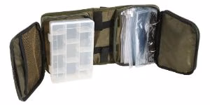 Mikado Fishing Bag For accessories and Sets UWI-211712. Raccoglitore per buste di esche in plastica morbida ed "hardbaits" con pagine trasparenti in pvc rimovibili e modulabili, questo "softbait-binder" ha anche una serie di tasche molto utili per accessori, utensili, minuteria e persino documenti. Ospita una scatola in plastica centrale, per alloggiamento di ulteriore minuteria per la pesca sportiva (ami, piombi, snap e girelle). Questo raccoglitore ibrido tra un portafoglio ed un astuccio con una cordura mimetica molto robusta, maniglia gommata, ed una serie di sistemi di chiusura con zip. Dimensioni 21 x 12 x 17 cm.