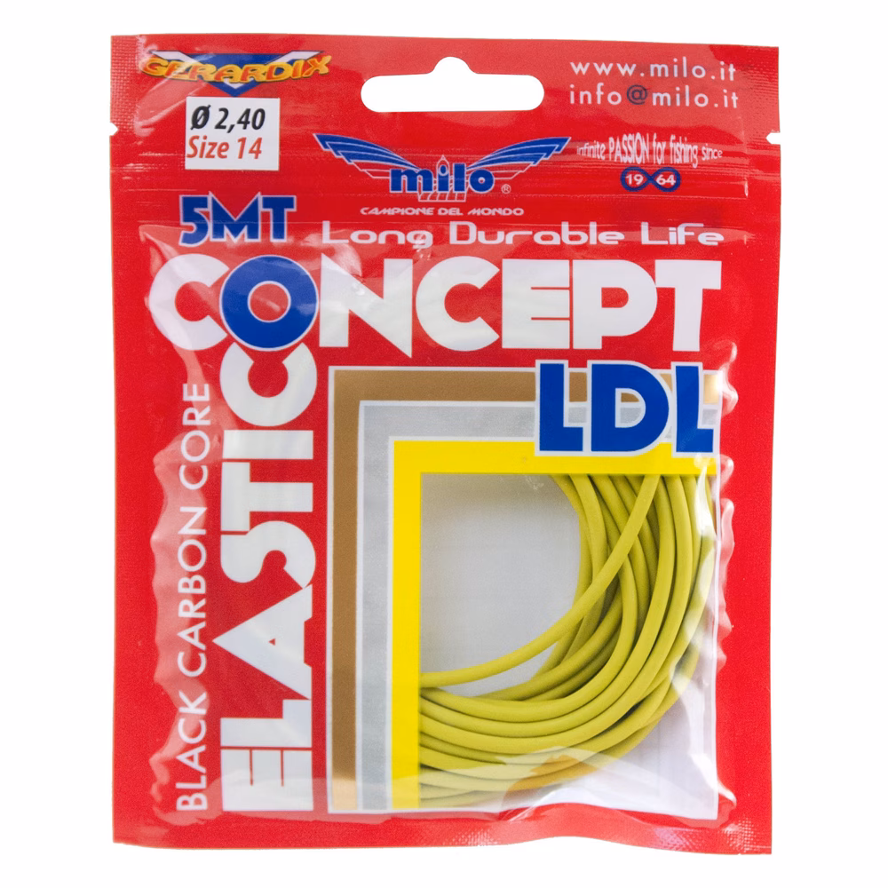Milo Concept LDL, elastico cavo Milo a lunga durata. Il Milo Concept LDL è un prodotto totalmente innovativo la cui tecnologia costruttiva si basa sull’utilizzo di un particolare pigmento che rinforza la gomma di cui è composto l’elastico rendendolo più performante e duraturo. Il "Carbon Black" è il cuore degli elastici da roubasienne e canna fissa Milo Concept LDL nonché l’innovazione che modificherà lo standard prestazionale degli elastici cavi perché questo pigmento riduce l’usura di tutti prodotti gommosi soggetti a trazione, frizione ed abrasione. A questo si aggiunge una ulteriore scelta tecnica, ossia l’utilizzo di colori UV assorbenti che preservano meglio l’elastico dalle radiazioni solari.