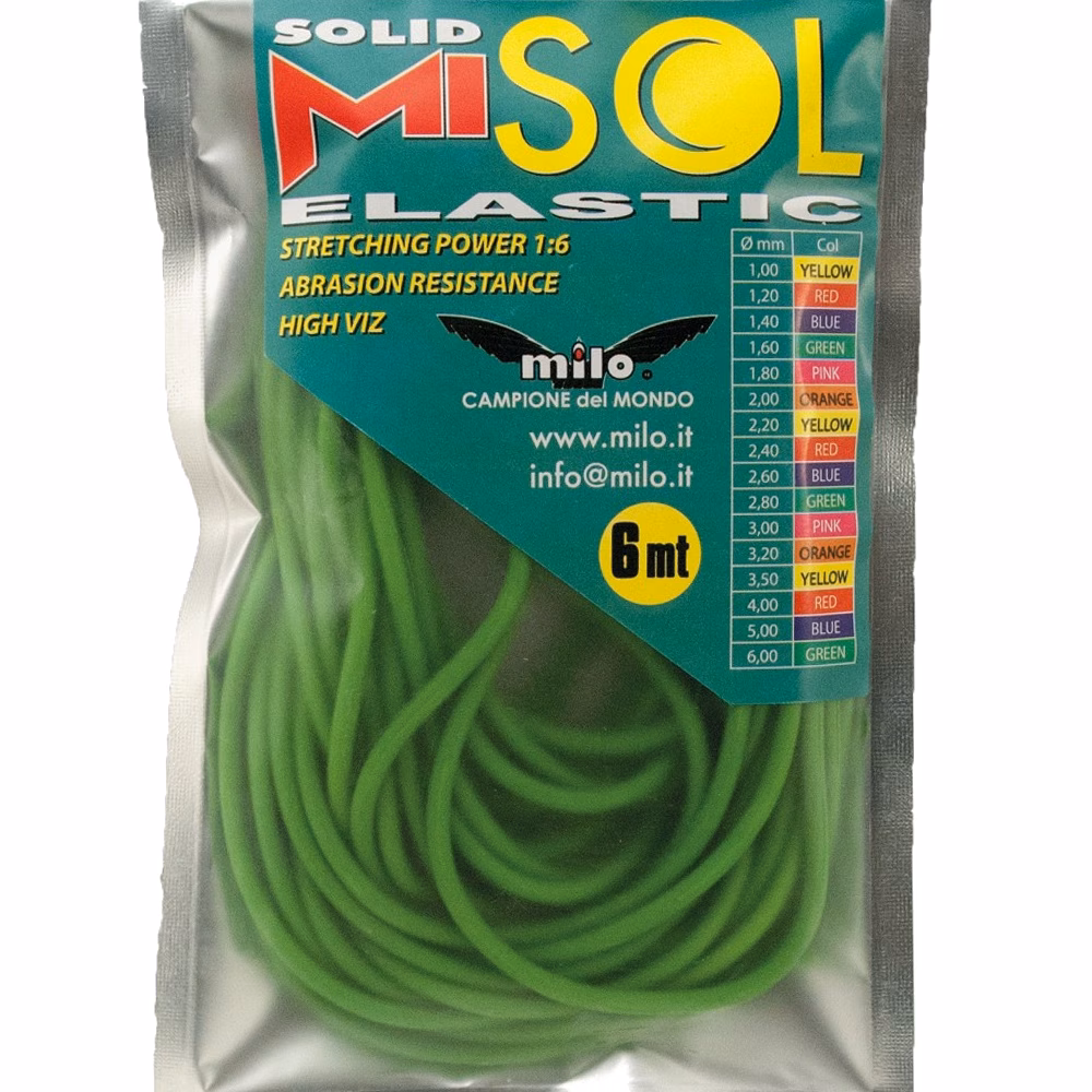 Elastico Milo Misol per roubasiene e canna fissa. Elastico per la pesca al colpo pieno Milo in lattice naturale. L’eccellente resistenza alle abrasioni, il coefficiente di allungamento di 1:6 e la vasta gamma di ben 17 diametri, lo rendono un elastico che ha come principale caratteristica la versatilità. Consigliato sia per la competizione al pesce bianco che per i grossi calibri quali carpe, siluri e storioni. L'elastico da competizione Milo Misol è proposto in sei colori. Confezione da 6.00 mt.