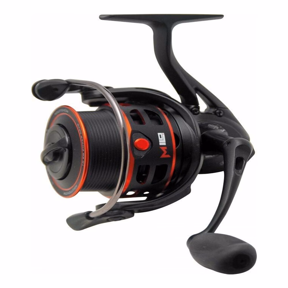 Mulinello Milo Redvolution. Mulinelli Milo nati per coprire diverse tecniche di pesca con le esche vive: pesca al colpo / match, feeder. Questo mulinello rappresenta il top di gamma nel catalogo Milo. Il mulinello Milo Redvolution è infatti realizzato con un corpo in polimero di grafite, risulta essere leggero ed allo stesso tempo resistente. Dispone di un rotore cavo, che ne alleggerisce ulteriormente il peso fino a 294 grammi nella misura più grande. La resistenza alla corrosione, in caso di utilizzo in acque salate, è garantita dalla completa impermeabilizzazione del corpo e del rotore. Particolare ed esclusiva è la bobina match, con doppia clip arrotondata ferma filo e ammortizzatore. I nove cuscinetti inox, la frizione multi disco impermeabilizzata e la manovella in EVA consentono massima fluidità e controllo in fase di recupero. Consigliato dal pluri Campione del Mondo Steve Gardener trova il suo utilizzo nella pesca all’inglese, a bolognese, a feeder. Frizione con un potere serrante di ben 10 kg. Equipaggiato con 8 cuscinetti a sfera ed 1 a rulli e con un fantastico archetto tubolare semi indeformabile. Con antiritorno! Il Milo Redvolution viene realizzato in diverse taglie per ogni esigenza.