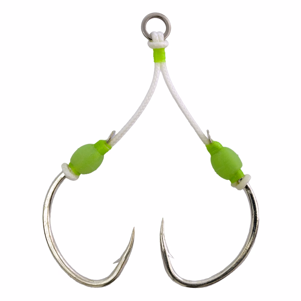Mustad Slow Pitch Double Jigging Assist Rig. The Mustad Slow Pitch J-Assist hook 3 Rig is designed for fast swimming fish or bottom feeders. The double hook rig features a heavy-duty solid ring tied to the wide gap Mustad hook with high quality PE and Kevlar materials. The two assist hooks are connected to the top end of the slim jigging lure to improve hookset, as the fish often strikes at the top end. Another benefit is less snags because of the absence of the traditional tail treble. The assist hook has two luminous beads to attract attention, creating a striking point. The slow pitch fishing technique has proven great on slow days when fish are not as active and less of a strain on the arms as speed jigging. These hooks were tested over a period of 2 years by Mustad's pro staff before they were launched.