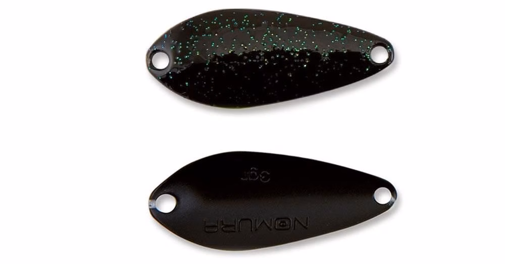 Nomura Isei Aki. ondulanti con amo singolo da trout area, una delle esche artficiali Nomura in metallo dedicate alla pesca a spinning della trota in laghetto. Corpo molto compatto, colori brillanti ed adescanti.