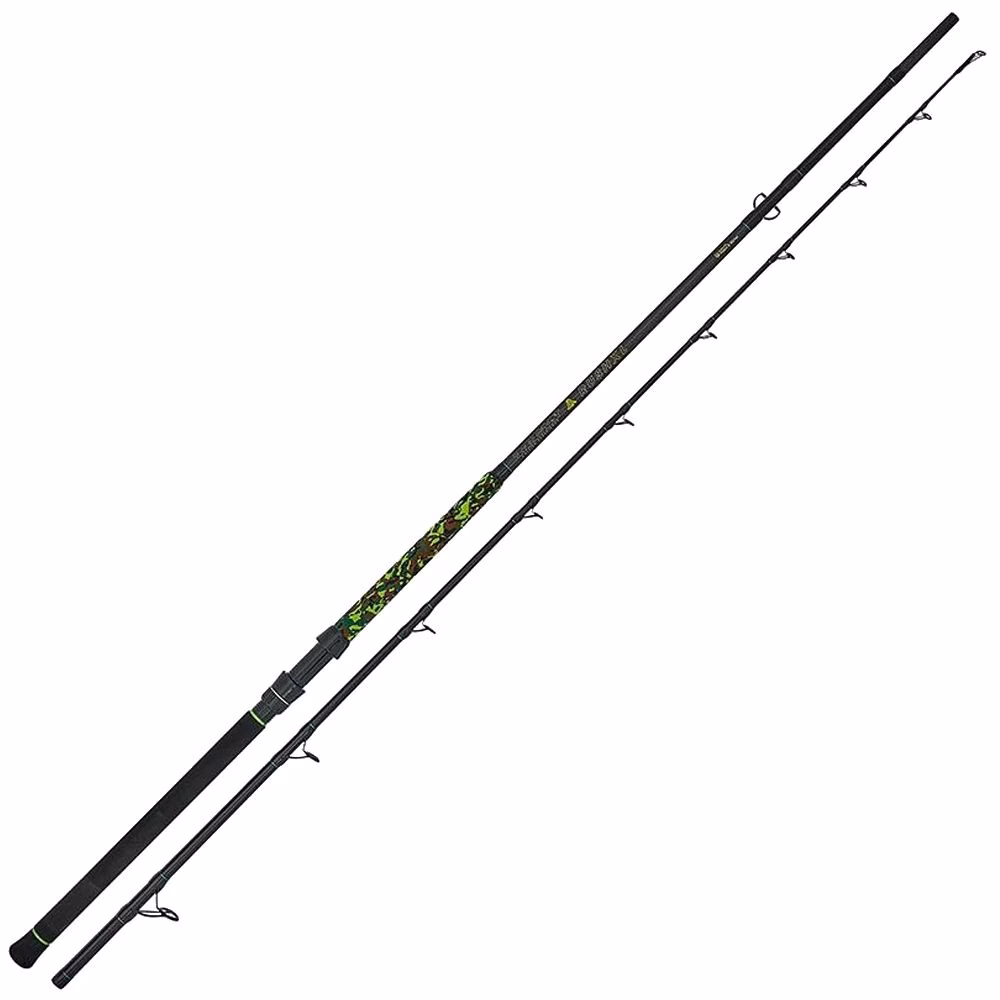 Pezon & Michel Titan Rush. Canna da pesca progettata espressamente per pescare il siluro, dalla riva o da una barca, a break line, con galleggiante o semplicemente a fondo, anche con pasturatore. Sotto pressione, la sua azione progressiva garantisce un combattimento efficace con i pesci più grandi. Mantiene un'eccellente sensibilità della punta per lanciare e animare con precisione un'esca e rimane abbastanza veloce da ferrare efficacemente da riva. Manopola di combattimento.